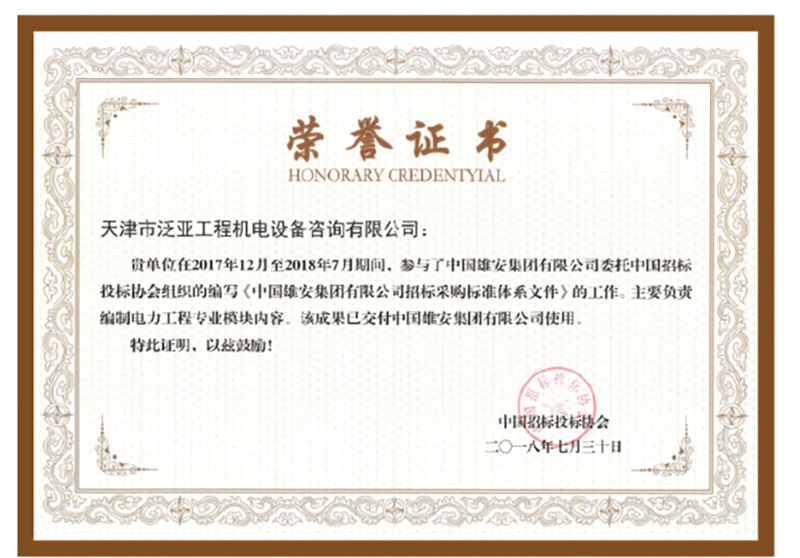 泛亞公司參與編制了雄安集團《中國雄安集團招標采購標準體系文件》,獨立完成了電力工程專業模塊的編制工作,為雄安新區的發展貢獻泛亞智慧,在雄安新區展現天津名片,得到各方好評。